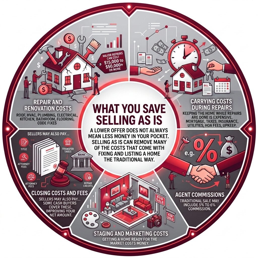 This is the section many sellers skip, and it is where mistakes happen. The visible costs are easy to spot. The hidden costs are the ones that quietly eat your profit. If you are still wondering how much do you lose selling house as-is, remember that you can also lose money by trying to chase a higher price the wrong way.