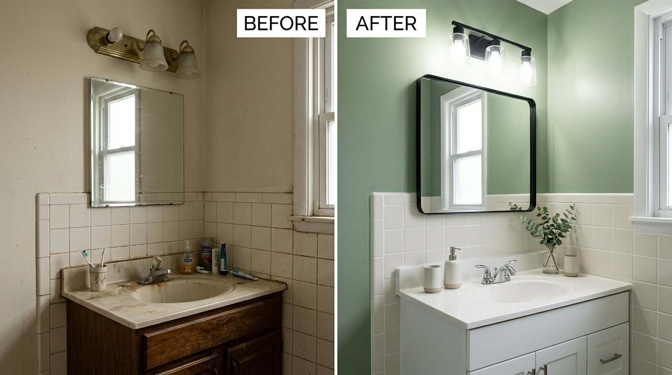 - A quick bathroom refresh like a new mirror, updated vanity light, fresh caulk, and clean grout