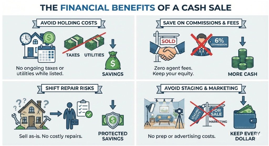 Many people do not realize that a cash sale can often put more money in your pocket than a traditional sale once all the hidden costs are calculated. You avoid the holding costs of property taxes and utilities that would continue to pile up while your home sits on the market.